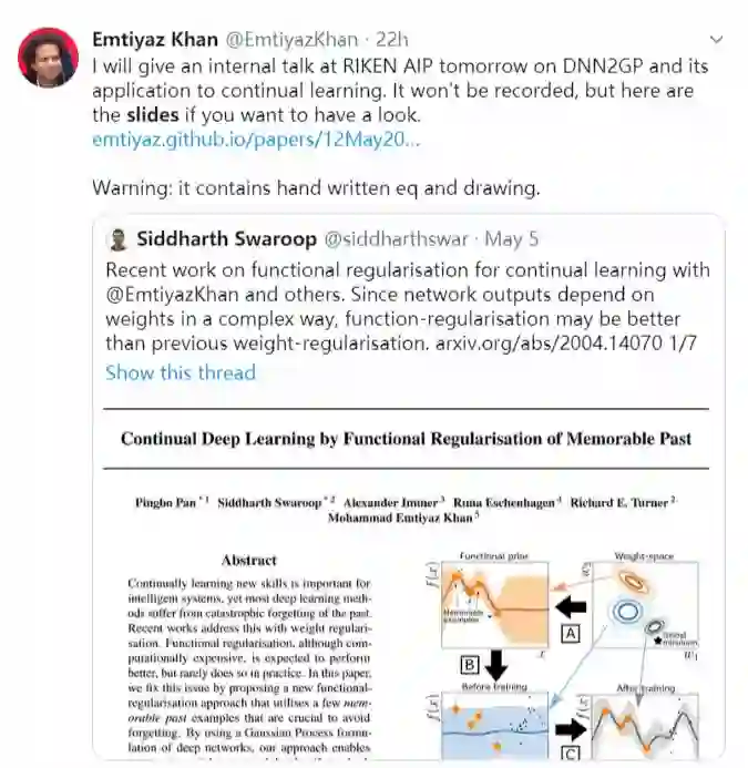 【导读】终身学习是机器学习中的热门研究话题之一。如何实现持续学习?来自东京RIKEN研究中心的Emtiyaz Khan给了关于从深度神经网络到高斯过程的教程《DNN2GP: From Deep Networks to Gaussian Processes》,共有45页ppt,以及撰写了最新的论文,通过提出一种新的函数正则化方法来解决这个问题,该方法利用了一些过去的难忘样例,这些样例对于避免遗忘至关重要。通过使用深度网络的高斯过程公式,能够在权重空间中进行训练,同时识别难忘的过去样例和功能性样例。非常具有启发性,值得查看!