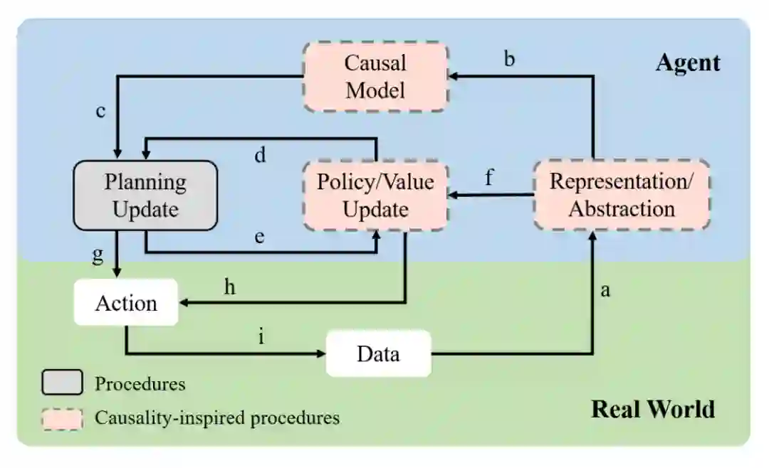 然而,强化学习仍有一些关键挑战需要解决。例如,**(一)数据效率低下。以前的方法大多需要交互数据,而在现实世界中,例如在医疗或医疗健康[11]中,只有少量记录数据可用,这主要是由于昂贵、不道德或困难的收集过程。(二)缺乏可解释性。**现有的方法往往通过深度神经网络将强化学习问题形式化,将序列数据作为输入,策略作为输出,属于黑盒理论。它们很难揭示数据背后的状态、动作或奖励之间的内部关系,也很难提供关于策略特征的直觉。这种挑战将阻碍其在工业工程中的实际应用。有趣的是,因果关系可能在处理上述强化学习[12],[13]的挑战中发挥着不可或缺的作用。因果关系考虑两个基本问题[14]:(1)因果关系的合法推断需要什么经验证据?利用证据发现因果关系的过程简称为因果发现。(2)给定一个现象的公认的因果信息,我们可以从这些信息中得出什么推论,如何推断?这种推断因果效果或其他利益的过程称为因果推断。因果关系可以授权智能体进行干预或通过因果阶梯进行反事实推理,放松了对大量训练数据的要求;它还能够描述世界模型,可能为智能体如何与环境交互提供可解释性。