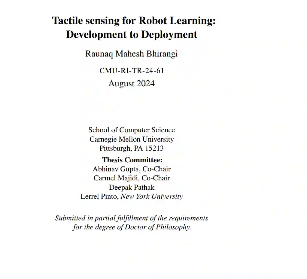 触觉感知在机器人与物理环境交互中扮演着重要角色,这一观点已被广泛认可。然而,现有的传感器中,少有能够在机器人领域中得到广泛应用。本文提出了一个将触觉感知融入机器人学习范式的框架,涵盖从开发到部署的全过程,并通过ReSkin——一种多功能且可扩展的磁性触觉传感器为实例。通过探讨ReSkin的设计、集成、策略学习和表示学习,本文旨在为机器人学习中有效的感知系统的实现提供指导。我们首先提出ReSkin——一个低成本、紧凑且多样化的触觉感知平台。我们开发了一种自监督学习技术,使得传感器具备可替换性,通过适应已学习的模型推广到新的传感器实例。接下来,我们在灵巧操作的背景下研究了ReSkin的可扩展性:我们引入了D'Manus,一个廉价、模块化且坚固的平台,集成了大面积的ReSkin传感,旨在满足机器人学习的大规模数据收集需求。基于ReSkin和D'Manus的开发经验,我们提出了AnySkin——一种专为机器人学习设计的升级版传感器,它进一步减少了不同传感器实例之间的响应差异。AnySkin的集成简单如同给手机戴上手机壳,无需粘附,并表现出更一致的信号。我们将AnySkin部署在精确操控的策略学习场景中,展示了在补充相机信息后任务性能的提升,并实现了跨传感器实例的零样本策略迁移。除了传感器的设计和部署,我们还探索了包括但不限于ReSkin在内的传感器的表示学习。传感数据通常是连续的、序列性的,但大多数现有的序列架构研究(如LSTM和Transformer)主要集中在离散模态,如文本和DNA。为填补这一空白,我们提出了分层状态空间模型(HiSS),一种概念上简单的新型连续序列到序列预测(CSP)方法。HiSS通过在时间轴上叠加结构化的状态空间模型来创建层次结构,并且在现有的序列模型(如因果Transformer、LSTM、S4和Mamba)中表现优异。此外,我们引入了CSP-Bench,一个来自真实感知数据的CSP任务新基准。CSP-Bench旨在解决CSP任务中缺乏真实世界数据集的问题,为从事该领域研究的学者提供了宝贵的资源。最后,我们总结了从ReSkin的开发到部署过程中的经验教训,并提出了将触觉感知带入主流机器人研究中的潜在方向。