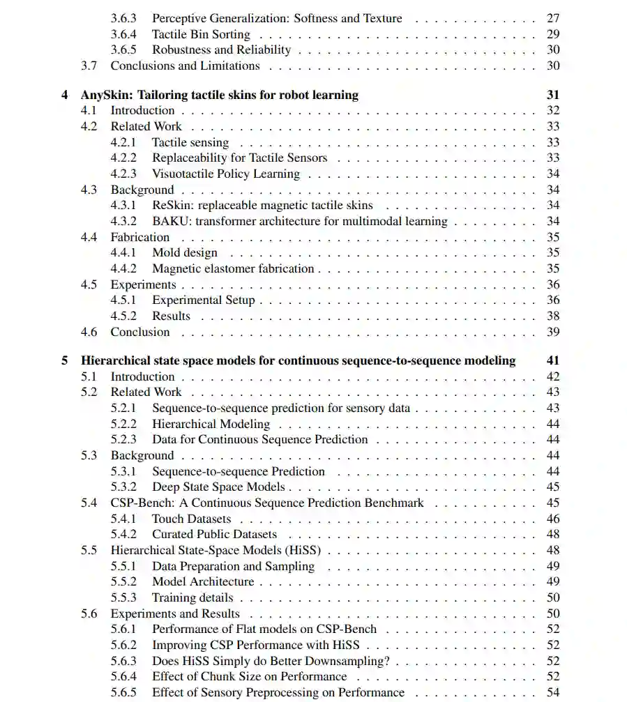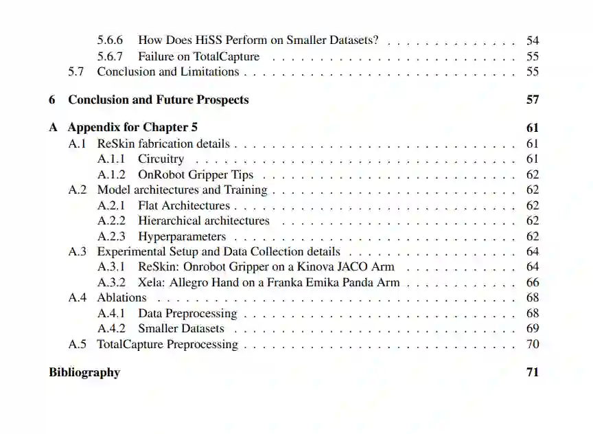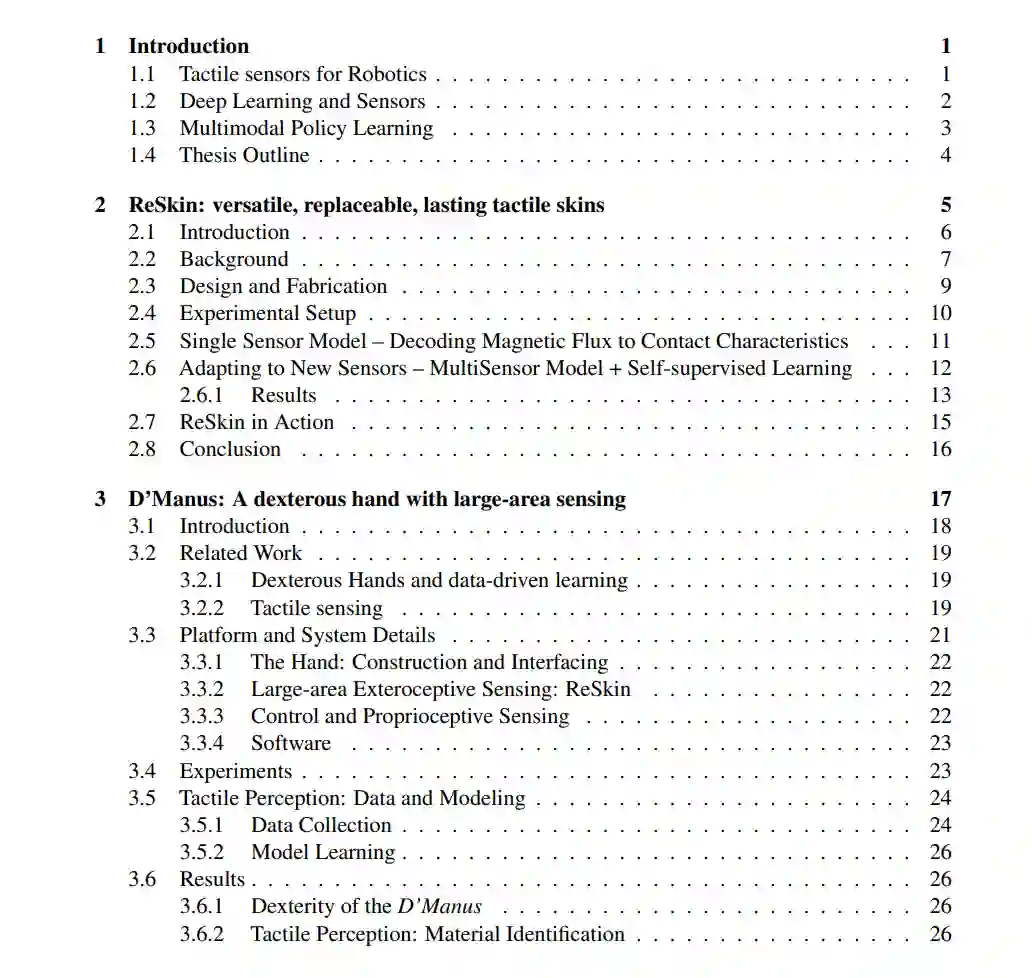 本文其余部分的结构如下:第二章介绍ReSkin——一种磁性触觉皮肤,它的能力以及学习传感器模型的潜力;第三章介绍D'Manus——一种开源的集成大面积感知的灵巧手设计;第四章介绍升级版的自粘式传感器皮肤设计,并展示其在策略学习中的可替换性;第五章讨论了一个新的基准数据集和一种针对触觉及其他传感数据的序列建模的新型学习架构。我们在第六章总结了主要经验教训并探讨了未来的研究方向。