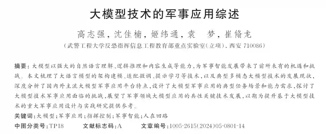关键词:大模型;军事应用;指挥控制;军事智能;人在回路