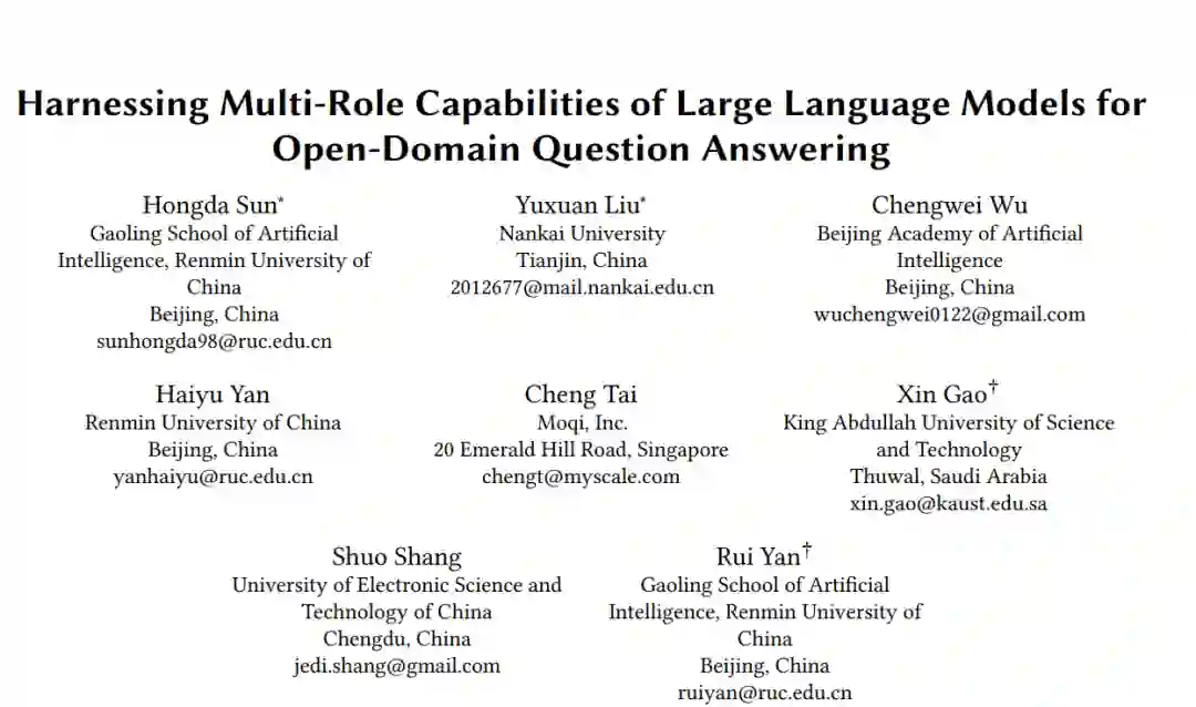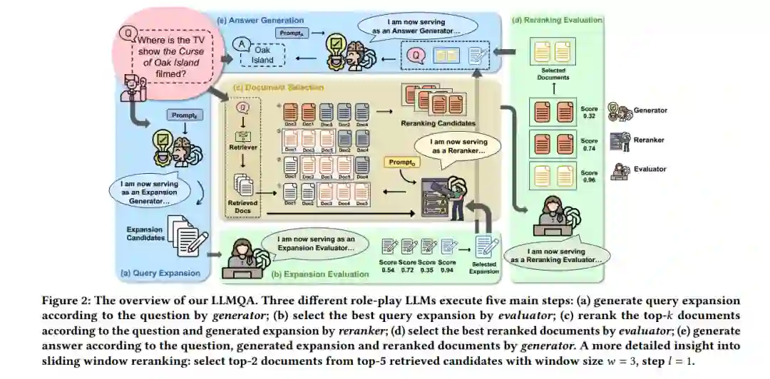 开放领域问答(ODQA)已成为信息系统研究的一个关键焦点。现有方法主要遵循两种范式来收集证据:(1)“检索-阅读”范式从外部语料库检索相关文档;(2)“生成-阅读”范式利用大型语言模型(LLMs)生成相关文档。然而,这两种方法都无法完全满足证据的多方面需求。为此,我们提出了LLMQA,一个通用框架,将ODQA过程划分为三个基本步骤:查询扩展、文档选择和答案生成,结合了基于检索和基于生成的证据的优势。由于LLMs展现出在完成各种任务上的出色能力,我们指导LLMs在我们的框架中扮演生成器、重新排序者和评估者等多重角色,将它们整合在ODQA过程中协同工作。此外,我们引入了一种新颖的提示优化算法来细化角色扮演提示,并指导LLMs产生更高质量的证据和答案。在广泛使用的基准测试(NQ, WebQ, 和 TriviaQA)上的大量实验结果表明,LLMQA在答案准确性和证据质量方面都取得了最佳性能,展示了其推进ODQA研究和应用的潜力。