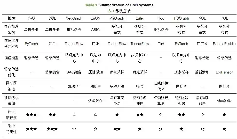 (1) 系统架构. DGL和PyTorch Geometric都是结合现有的深度学习框架来实现的, 并且针对图神经网络的特点做了多种优化, 达到了很好的性能. 结合现有深度学习框架来实现的系统, 更加方便用户使用, 能够帮助其更快地实现图神经网络模型. 但结合现有深度学习框架来实现的系统, 在针对图操作的优化上有很多局限性. NeuGraph采用了一种新的架构, 将图模型和数据流模型结合起来, 以支持高效的图神经网络训练, 这种架构既弥补了现有数据流引擎不能有效地支持图计算的缺点, 又弥补了图引擎不能支持数据流编程模型的缺点. EnGN在统一的处理模型基础上, 开发了一个定制的EnGN加速器, 它集成了一个神经图处理单元(NGPU), 可以在统一的体系结构中执行特征提取, 聚合和更新操作. EnGN的专用加速器突破了硬件结构的限制, 相比于其他系统配备的多个CPU或GPU, 大大降低了成本和能源开销. AliGraph、Euler和PGL的架构类似, 都采用分层架构, 构建于现有数据流框架之上, 并且都构建在CPU平台上. Roc将图神经网络的计算分布在多个计算节点上, 每个计算节点可以包含多个GPU, 每个计算节点在子图上执行图神经网络的训练, 并与CPU通信来获得输入张量并保存中间结果. Roc采用分布式多GPU的架构不仅解决了单节点系统对于大规模图的限制, 并且比基于CPU的系统更高效. AGL、PSGraph都是利用现有大数据处理系统和参数服务器的并行体系结构来组建的基于CPU的分布式图神经网络训练框架, 这些系统具有良好的容错性和可伸缩性.