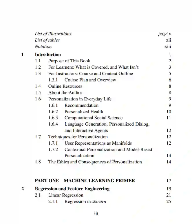 本书首先修正了“传统的”机器学习模型,并特别关注如何使它们适应涉及用户数据的设置。稍后,我们将开发基于更高级原则的技术,如矩阵分解、深度学习和生成建模。最后,我们对部署个性化预测系统的后果和风险进行了详细的研究。