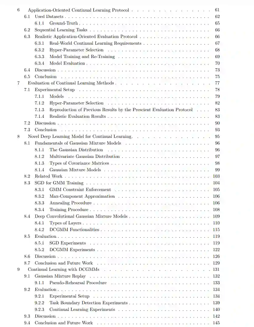 然而,DNN会受到一个问题的影响,即无法将新知识添加到现有的知识库中。不断积累知识的能力是促进进化的重要因素,因此是发展强大人工智能的先决条件。所谓的“灾难性遗忘”(CF)效应导致DNN在对新数据分布进行几次训练迭代后,立即失去已经派生的知识。只有用过去和新数据的联合数据分布进行昂贵的再训练,才能抽象出整个新知识集。为了抵消这种影响,各种旨在缓解甚至解决CF问题的技术已经并且仍在开发中。这些已发表的CF回避研究通常暗示他们的方法对各种持续学习任务的有效性。本文的研究背景是基于深度学习方法的持续机器学习。第一部分是面向实际应用的评估协议的开发,该协议可以用于研究不同的机器学习模型对协同效应的抑制。在第二部分,综合研究表明,在面向应用的需求下,所研究的模型都不能表现出令人满意的持续学习效果。第三部分提出了一种新的深度学习模型——深度卷积高斯混合模型(deep Convolutional Gaussian Mixture Models, DCGMMs)。DCGMMs建立在无监督高斯混合模型(GMMs)的基础上。GMM不能被认为是深度学习方法,它必须在训练前以数据驱动的方式进行初始化。这些方面限制了GMM在持续学习场景中的使用。