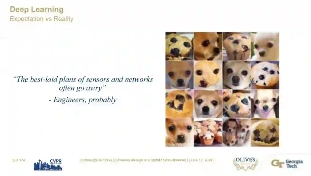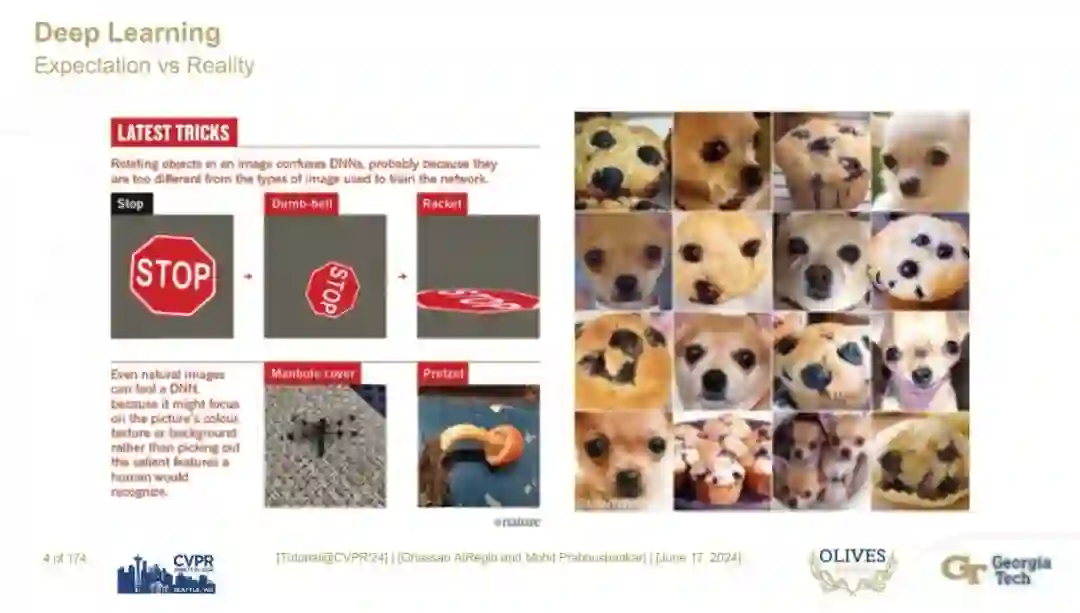 神经网络提供了具有普遍适用性和任务独立性的表示空间,这些表示空间在图像理解应用中得到了广泛应用。图像数据中特征交互的复杂语义已被分解为一组非线性函数、卷积参数、注意力机制以及多模态输入等。这些操作的复杂性引入了神经网络架构中的多种漏洞,包括对抗样本、自信校准问题和灾难性遗忘等。鉴于人工智能有望引领第四次工业革命,理解和克服这些漏洞至关重要。实现这一目标需要创建驱动AI系统的鲁棒神经网络。然而,定义鲁棒性并非易事。简单的对噪声和扰动不变性的测量在现实环境中并不适用。在本教程中,我们提供了一种以人为中心的方法来理解神经网络的鲁棒性,使AI能够在社会中正常运行。因此,我们提出以下几点: