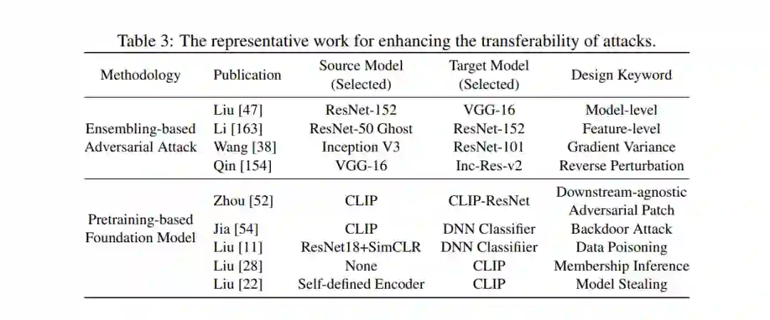从模型的角度来看,可转移攻击需要对各种目标模型进行泛化。为了提高攻击的可转移性,已经做出了许多努力,例如集成、模型预训练和替代模型优化。在本节中,我们从模型角度回顾了与可转移性相关的研究。为了增强攻击的可转移性,最大化替代模型与目标模型之间的相似性至关重要。借鉴集成学习原则,同时使用多种不同的模型架构可以确保设计的攻击与各种潜在模型兼容。此外,攻击预训练的基础模型可以影响下游的微调模型。最后,我们审查了在模型窃取攻击背景下优化替代模型的不同策略,增强其与目标模型的相似度。通过这种方式,我们可以提高可转移攻击的成功率。