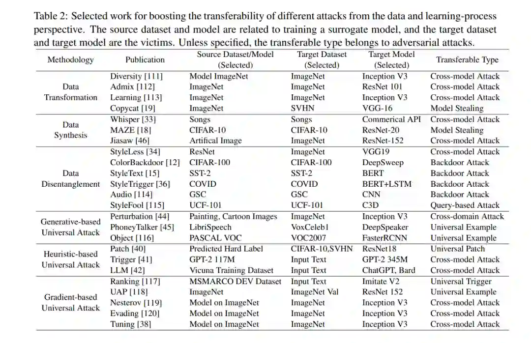 (iv) 我们在第六部分从系统角度展示了可转移的攻击。我们关注计算机视觉系统、语音识别系统和大型语言模型(LLM)系统。对于每个系统,攻击设计取决于特定模态的特征和系统的威胁模型。例如,生物特征安全是计算机视觉和语音处理中的一个重要话题。不同的生物特征应用程序,如面部识别、3D面部认证和声音认证,有不同的模型设计,需要针对特定的攻击进行调整。最后,在第七部分,我们总结了当前可转移攻击的局限性,并提出了未来的设计方向。我们的最终目标是激励健壮、适应性强、安全的互联网物理系统的发展。 这份综述的独特贡献。与现有的综述相比,本综述全面评估了从转移性角度看各种攻击。表1列出了现有关于各种攻击的综述。每种基于学习的攻击都有根据不同数据模态(如图像、文本、音频、视频和图表)的不同设计原则。大多数综述[55, 64, 96, 82]只关注一种特定类型的攻击,如对抗性攻击或模型窃取攻击。相比之下,我们从转移性的角度总结了六种广泛研究的攻击。转移性的概念至关重要,因为它揭示了威胁景观比预期的更广泛,因为机器学习模型即使在攻击者无法直接访问模型的架构或参数时,也可能对不同的攻击敏感。转移性对于机器学习模型在现实世界应用中的普适性和安全性提出了问题。一些综述[56, 62, 64]只关注特定的应用领域,如自然语言处理(NLP)。我们不限于特定领域,而是在不同的模态、不同的应用和系统中回顾了可转移的攻击。我们通过从数据、过程、模型和系统的角度审视,对可转移的攻击设计进行了分类和总结。特别是,我们回顾了可转移攻击对典型的网络物理系统(包括自动驾驶、语音识别和LLM系统)的影响。总体而言,本综述提供了关于最新的可转移攻击策略的全面见解,使不同攻击类型在不同领域之间能够进行横向和纵向比较。