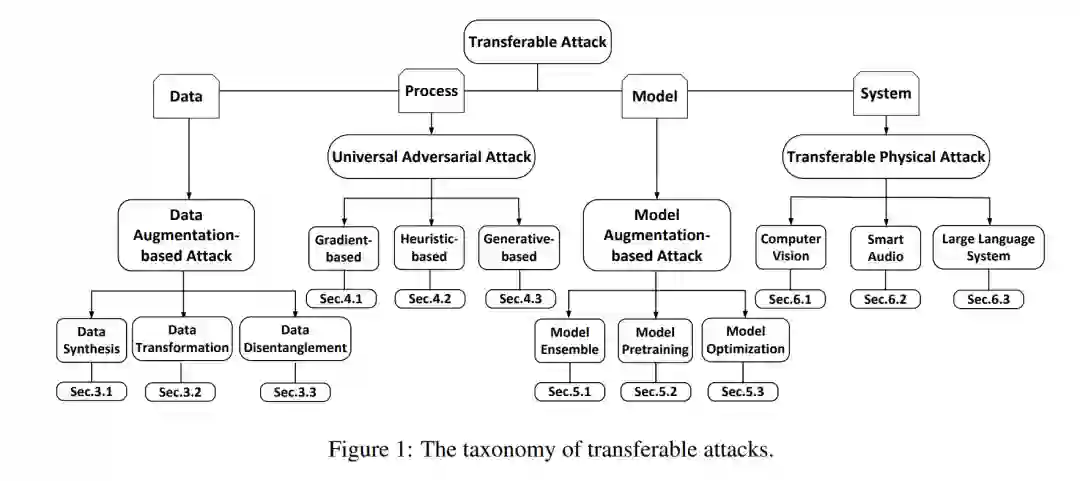 本综述聚焦于可转移性,在不同领域对各种攻击进行了回顾和分析。我们首先提供了关于基于学习的攻击设计的背景知识。然后,从数据、过程、模型和系统的角度,我们总结了增强不同攻击可转移性的最新研究。特别是,我们回顾了基于数据增强的各种增强可转移性的攻击方法。我们总结了构建跨领域通用对抗性攻击的梯度、启发式和基于生成的方法。从模型角度出发,我们探讨了增强可转移性的方法,包括基于集成的方法、优化技术,以及使用预训练的基础模型。此外,我们还回顾了在不同领域如计算机视觉系统、语音识别系统和大型语言模型系统中的可转移攻击应用。总之,我们识别了未来研究应该解决的各种挑战。研究可转移攻击可以协助开发对策,增强系统防御,并有助于更安全可靠的机器学习模型的发展。