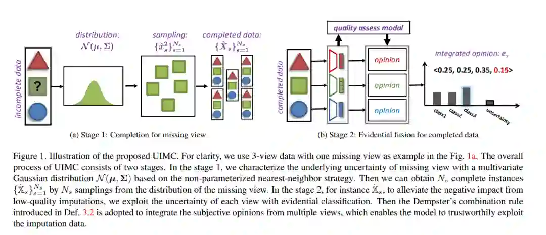 在现实世界的应用中,任意视图缺失普遍存在,因此对不完整的多视图数据进行分类是不可避免的。尽管已经取得了很大的进展,但由于缺失视图具有较高的不确定性,现有的不完整多视图方法仍然难以获得可信的预测。首先,缺失视图具有高度的不确定性,因此提供单一的确定性填补是不合理的。其次,估算数据本身的质量具有高度的不确定性。为了探索和利用不确定性,我们提出了一种不确定性诱导的不完整多视图数据分类(UIMC)模型,在稳定可靠的框架下对不完整多视图数据进行分类。我们构建一个分布并多次采样以表征缺失视图的不确定性,并根据采样质量自适应地利用它们。因此,所提方法实现了更加可感知的填补和可控的融合。具体来说,我们根据可用视图对每个缺失数据建立一个分布模型,从而引入不确定性。然后采用一种基于证据的融合策略来确保插补视图的可信融合。在多个基准数据集上进行了广泛的实验,我们的方法在性能和可信性方面都取得了最先进的性能。