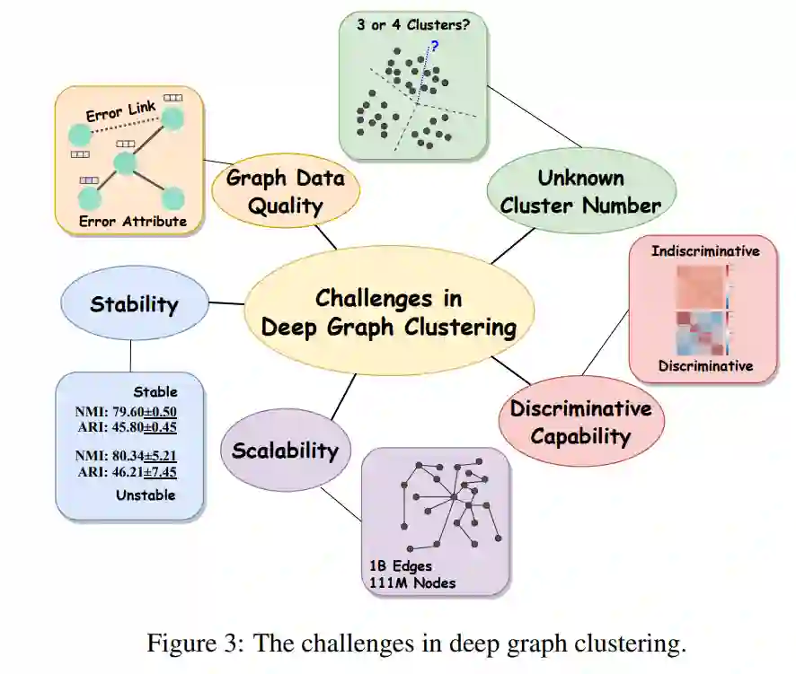 尽管取得了显著的进步,但这个快速发展的领域仍然充满了一些关键的挑战。因此,本节总结了图3中深度图聚类的挑战。具体而言,主要挑战包括图数据质量、稳定性、可扩展性、可区分性以及聚类数目未知等问题。详细的分析和潜在的解决方案将在第4节中提供。