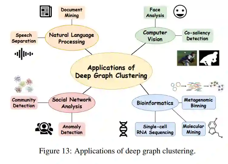 深度图聚类由于其强大的数据划分能力,已被应用到现实世界的不同应用领域,如社会网络分析、计算机视觉、自然语言处理、生物信息学等。如图13所示,深度图聚类的具体应用包括人脸分析[Wang et al., 2019b;Wang等,2022b],异常检测[Ahmed等,2021;Ma等,2021],共显著性检测[Zhang等,2020a],文档挖掘[Chiu等,2020],语音分离[Qin等,2020],社区检测[Cavallari等,2017;Rozemberczki等人,2019;屠等,2018;Liu等,2020],分子挖掘[Grunig等,2022;Xia et al., 2022c],宏基因组bin [Xue et al., 2022],单细胞RNA测序[Yu et al., 2022b]等。