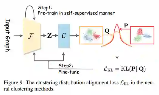 深度图聚类中的聚类方法旨在以无监督的方式将学习到的节点嵌入到不同的聚类中。它们可以分为两类:传统聚类和神经聚类。
