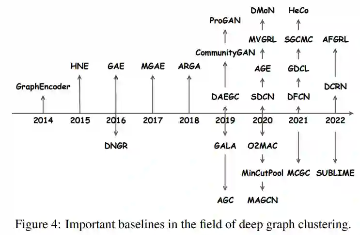 图4总结了深度图聚类领域的重要基线。这些论文已在数据挖掘、人工智能、机器学习、计算机视觉、多媒体等领域有影响力的国际会议或高质量期刊上发表。此外,在本次综述结束之前,这些文章每年至少被引用10次,相应的代码是可用的,并且是可靠的。接下来,我们将详细介绍这些重要的方法。
