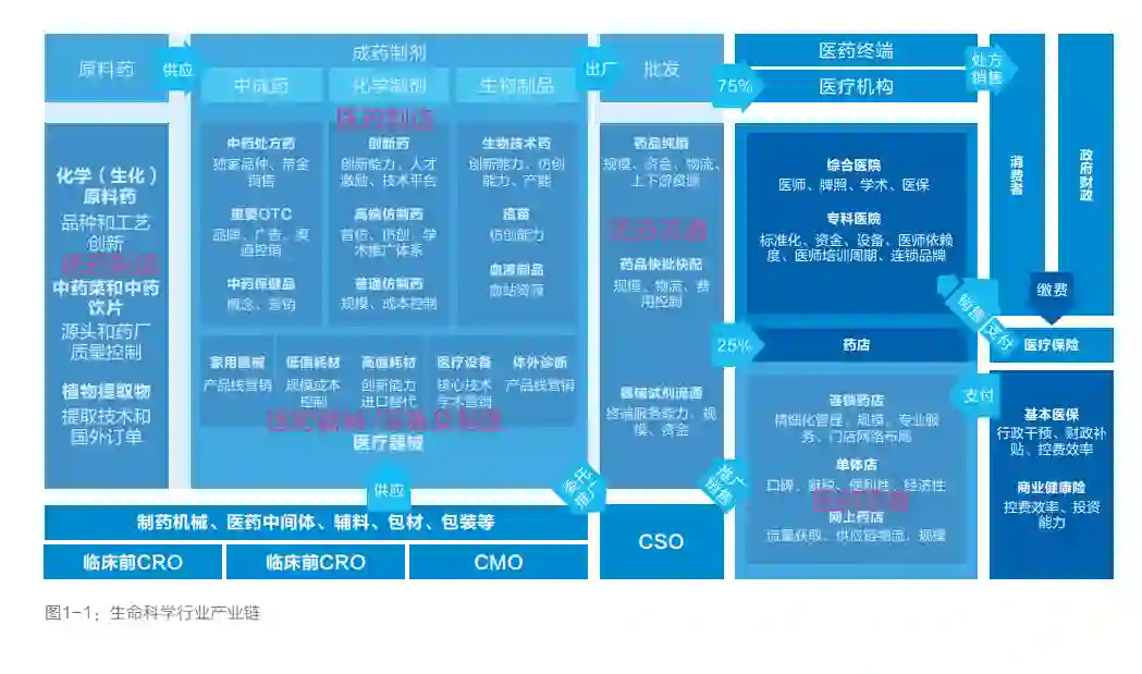 生命科学行业涉及面广,主要覆盖医药制造、医疗器械、医药流通以及医药零售等板块。医药制 造关注药品的研发、生产及销售,包括中药、化学药以及生物药等。医疗器械专注于医疗耗材与设备 的研发、制造及销售,包括诊断试剂、手术器械、成像与监测设备等。医疗流通主要涉及医药产品的 分销及供应链管理,医药零售是讲药品/器械直接提供给最终用户的环节,包括线下药店及网上药店。这些板块相互关联,共同推动生命科学领域的发展,以改善人们的生活质量和健康状况。