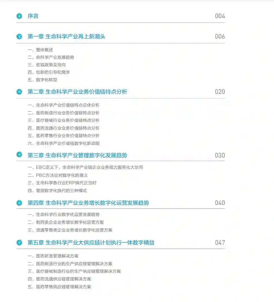 过去十年,中国生命科学行业飞速发展,其扩展速度甚至比整体经济的发展更快。中国政府制定 了一个为全体国民提供可负担和有效医疗服务的远大目标,与此同时,政府也通过多种举措扶持培育 国内生命科学行业的发展,使其能够提供高质量的产品和服务。由于疫情波动和地缘政治冲突对航运和物流造成影响,生物科技、制药和医疗器械领域的企业认 识到提高灵活性、简化制造流程并加强实时跟踪的必要性。因此,打造敏捷供应链成为企业应对外部 环境挑战的关键因素,这种供应链可灵活变通、快速适应多变的环境和多样的场景。我们预期该行业 将进一步采用和推广数字技术,提高药品供应链的灵活性。未来,变革依旧是生命科学行业的主旋律。业绩增长与良好的资产负债表让生命科学行业的许多 企业作出增加投资的决策,预计企业对产品组合的投资(包括下一代疗法及其投资)将充分利用其数 字化转型的成果。随着可用的数据收集和分析工具日益丰富,生命科学行业将大规模应用数字技术。新的标准已设立,那些行动敏捷、愿意打破传统直面严峻挑战的企业,必将成为最大的赢家。