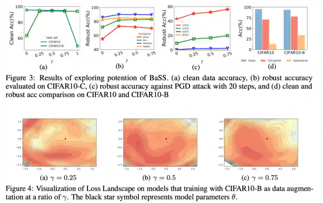 具体来说,我们研究了两种使用平衡频谱图像的范式: (i)数据增强,其中每个训练图像由BaSS以的概率执行。(ii)新的数据集,其中训练集和测试集完全由采样图像组成。 我们在CIFAR10数据集上进行了探索,将作用了BaSS策略的数据集命名为CIFAR10-B。三种评价指标作为模型性能的评估:(1)干净样本的准确率;(2)corruption robustness;(3)adversarial robustness。