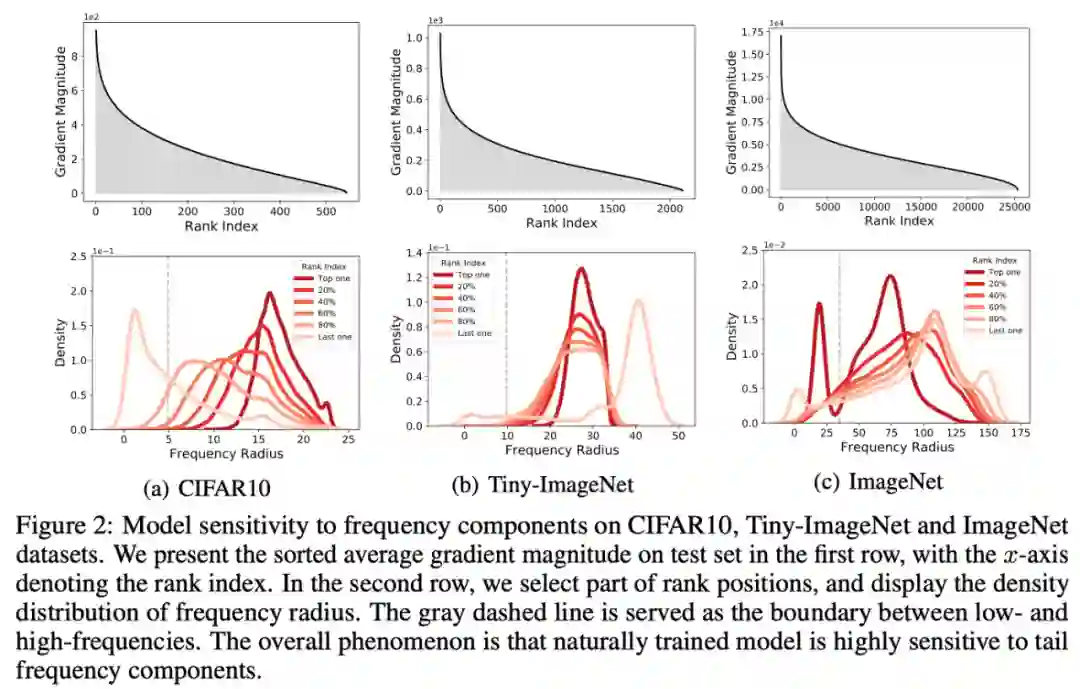 对此,我们将损失的梯度投影在输入图像的不同频域方向。模型对于不同频域分量的敏感性由不同频域方向的梯度强度(投影的坐标大小)来衡量。我们获取所有图像的投影情况,并使用核密度估计(KDE)估计不同等级强度的频率方向分布。我们分别分析了 CIFAR10、 Tiny-ImageNet 和 ImageNet的结果,如下图所示。