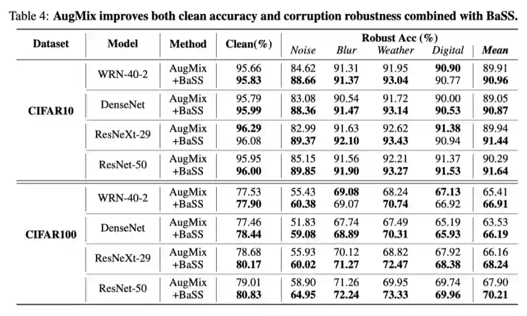 AugMix通过数据增强生成复杂多样的图像,提高了模型对不同类型扰动的鲁棒性。具体来说,对于原始数据、通过组合多个简单数据增强生成 ,然后在训练过程中对和应用一致性约束。实验通常涉及两个 AugMix 过程来获得和。为了验证我们增加数据信息的方法 BaSS 是否可以与 AugMix 方法结合使用,我们对其中一个增强的输入数据 执行 BaSS 操作以获得 ,然后执行 AugMix 获得 。模型训练过程限制 、 和 的一致性。