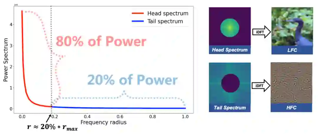 简单来说,我们受到长尾分布中二八定律(帕累托法则)的启发,将占据频谱总能量80%的位置定义为头部低频分量,剩余20%能量的位置定义为尾部高频分量。在频域长尾模型中,轴得到物理意义为第 个频带,轴的物理意义为第 个频带的能量占据总能量的比例 . 因此, 图像中的低频分量(LFC)可形式化定义为: 高频分量(HFC)可形式化定义为: 我们从长尾模型的角度对频率特征的统计总结如下:(i)头部由少数低频带组成,占频谱能量的大部分,语义和信息密度高;(ii)尾部由大量高频带组成,但保持低功率分布。这部分包括高频语义信息(例如纹理)以及人类无法察觉的信息。