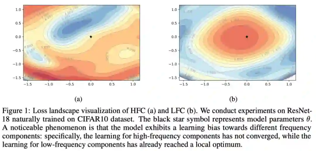 在本小节中,我们将探讨有关模型对频率分量的学习行为。具体来说,我们可视化和分析了LFC和HFC上分类器的loss landscape。如下图所示。