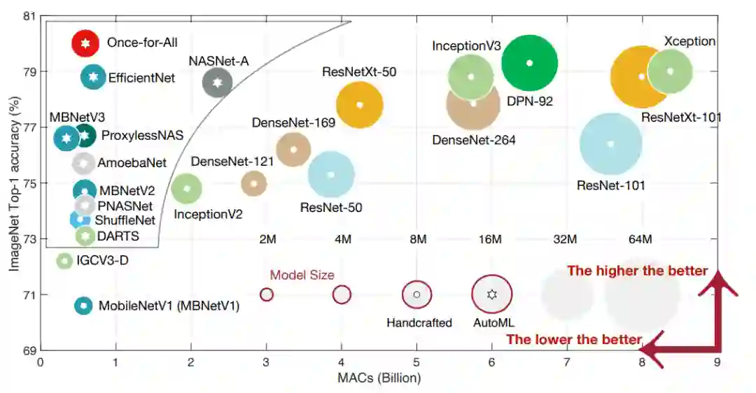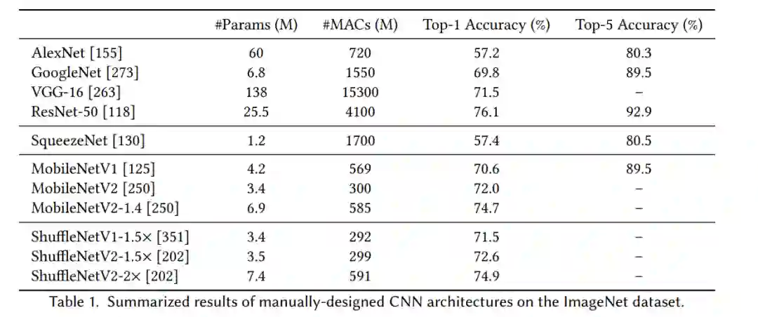 上图报告了ImageNet上自动设计和人工设计CNN模型的总结结果。NAS节省了工程师的人工成本,并提供了比人工设计的CNN更好的模型。除了ImageNet分类,自动设计的CNN模型在目标检测[46,91,278,367]和语义分割[40,184]方面也优于手动设计的CNN模型。