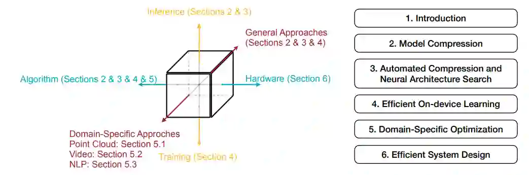 已有许多研究涉及模型压缩[50,54,68]、自动化机器学习[78,119,317]、高效硬件架构设计[272]和特定任务优化[283]。本文旨在涵盖更广泛的有效深度学习方法和应用:从手动到自动,从新的原语/操作设计到设计空间探索,从训练到推理,从算法到硬件,从通用到特定应用的优化。我们相信,这篇综述论文将为这一领域提供一个更全面的视角。本文其余部分的结构如下(图1): * 第二节讨论了各种模型压缩方法,包括剪枝、低秩分解、量化、知识精馏和紧凑模型设计。 * 第三节研究用于模型压缩和神经结构搜索的AutoML框架。 * 第四节描述了有效的设备上训练(一般/迁移学习技术)。 * 第五节研究点云、视频和语言的特定应用程序加速。 * 第六节介绍了深度学习的高效软件/硬件设计。