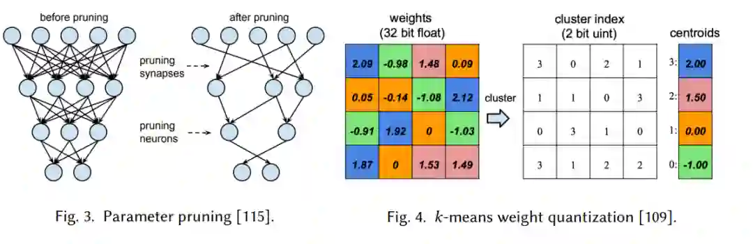 深度神经网络通常是过度参数化的。剪枝去除神经网络中的冗余元素,以减少模型大小和计算成本(图3)。