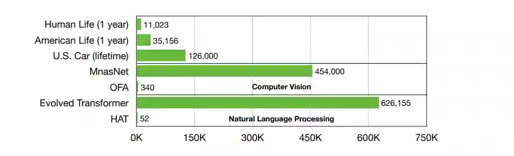 如此高的计算成本远远超出了大多数移动设备的能力,从汽车到移动电话和物联网设备,因为它们的硬件资源受到外形因素、电池和散热的严格限制。然而,这些计算工作量不能委托给云服务器,因为它们对延迟(例如,自动驾驶)和/或隐私(例如,医疗保健)非常敏感[199,360]。因此,高效的深度学习是移动AI应用的一大需求。为了加快神经网络推理的速度,研究者们提出了多种模型压缩技术,包括剪枝[115,121,195]、低秩分解[149,332,352]和量化[62,114,133]。除了建立在现有的大型模型之上,研究人员还探索了直接从零开始设计高效的神经网络,包括MobileNets[125,250]、ShuffleNets[202,351]和SqueezeNets[202,351]。这些解决方案通常需要大量人力的努力,因为有一堆参数需要共同调整,以实现最佳性能:例如,修剪比和每一层的量化位宽。为此,有很多探索使用自动机器学习(AutoML)调节参数解决人类的设计过程的耗时,如神经结构搜索(NAS)[29、106、187、277、366),自动修剪(120、196、336)和自动量化(299、300、306)。然而,AutoML的好处并不是免费的,因为它会显著增加碳足迹: 进化Transformer [264]产生了5辆美国汽车的终生二氧化碳排放量(见图2)。为了实现绿色和可持续的人工智能,研究人员提出了高效搜索高效神经结构[25,296],该神经结构可以达到相同的精度水平,同时减少碳足迹的数量级。