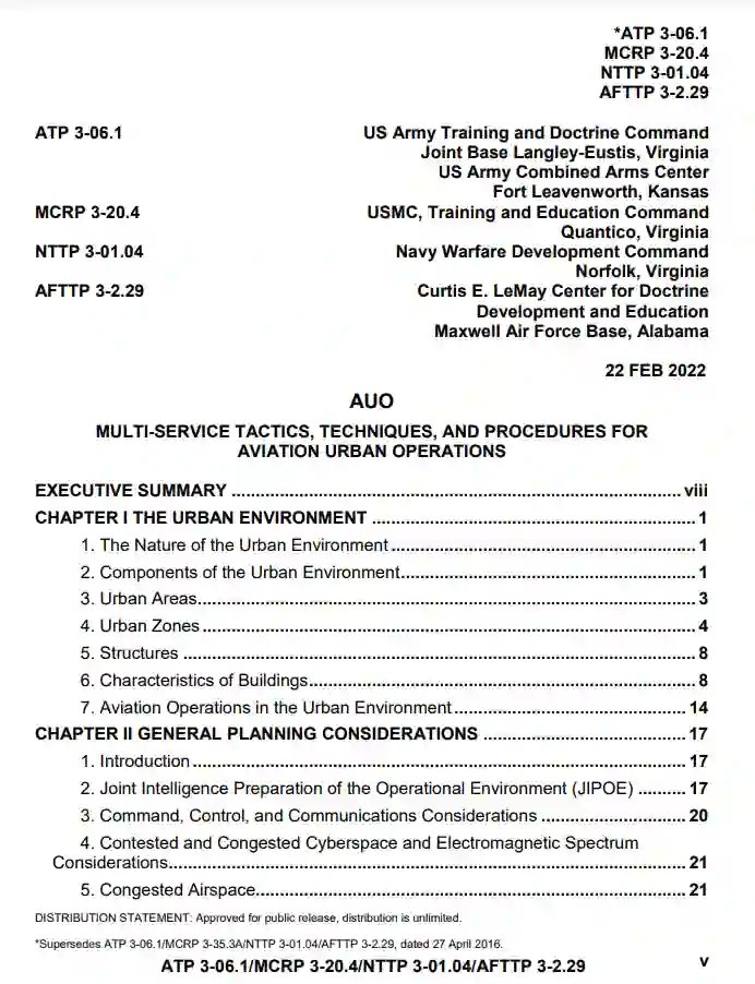 本手册是一份战术层面的文件,用于规划和实施城市环境中的航空作战。本手册是对既定条令的补充,为协助航空和地面人员规划和执行城市作战的战术航空支援提供了单一来源的参考。它促进了对城市地形复杂性的理解,并将学到的经验纳入MTTP。本出版物并不完全涉及城市作战中使用的所有空中力量的功能,因为这些主题在其他适当的联合和服务出版物中都有涉及。