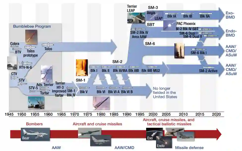 图5. 标准导弹家族的历史。该系列目前包括SM-2,SM-6和SM-3。APL是所有SM变体的全方位(AUR)的技术指导机构。Blk,Block;BTV,燃烧器试验车;CMD,巡航导弹防御;CTV,控制试验车;ENDO,内大气层;EXO,外大气层;LEAP,轻型外大气层弹丸;MU2,机动性升级2;PAC,太平洋;RTV,冲压式试验车;SBT,海基终端;STV,超音速试验车;TBM,战术弹道导弹。