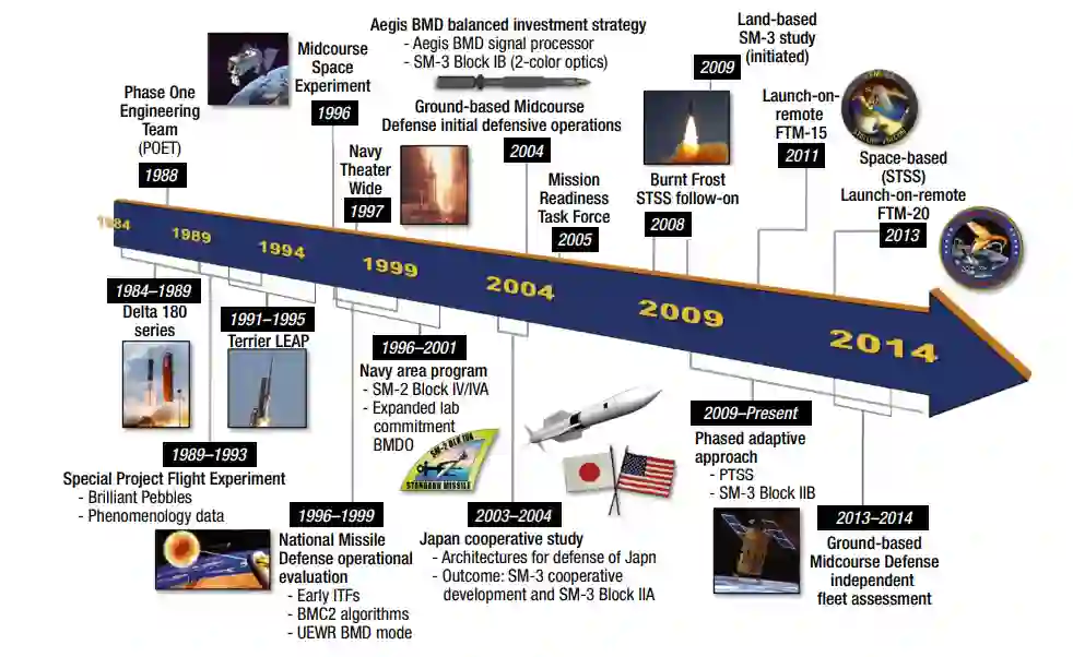 除了 "宙斯盾"、"标准导弹 "和 "CEC "能力的发展,APL一直是AMD社区的推动者、思想领袖和其他一些赞助商和利益相关者的能力提供者。这些主要利益相关者之一是导弹防御局(MDA)。MDA成立于2002年,主要任务是与各军种(空军、陆军和海军)密切协调,对BMD系统进行设计、开发、测试和投入使用。APL作为早期的技术领导者加入了MDA(以及前身的战略防御倡议办公室,或SDIO,和弹道导弹防御组织,或BMDO),产生了早期的弹道导弹对手框架,以及通过协调BMDS资产的综合能力概念来对抗这些对手的方法。图7显示了APL在BMD方面的历史。