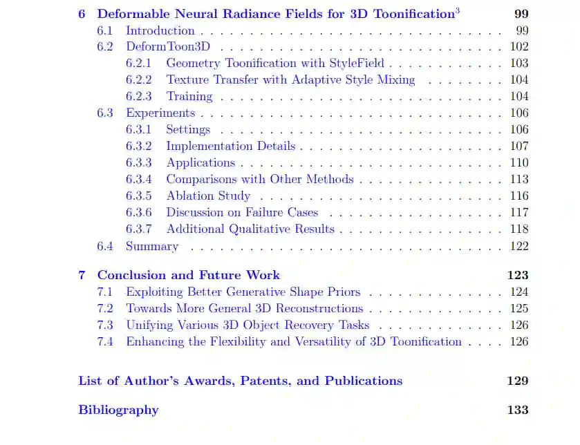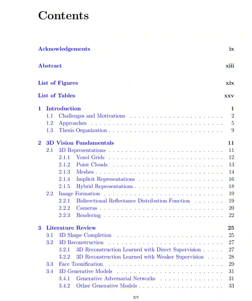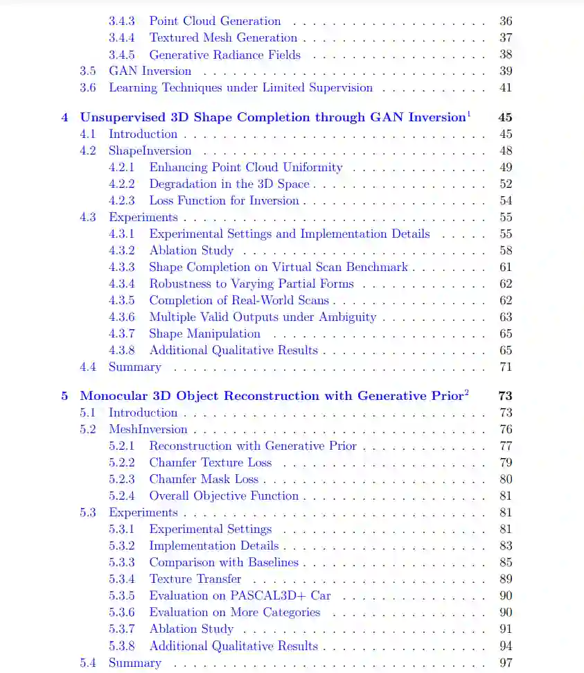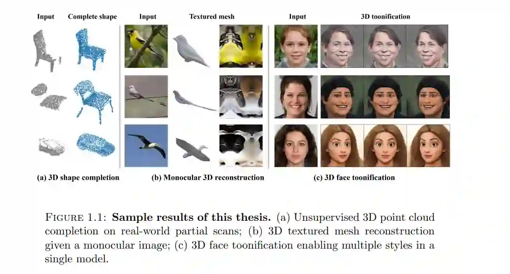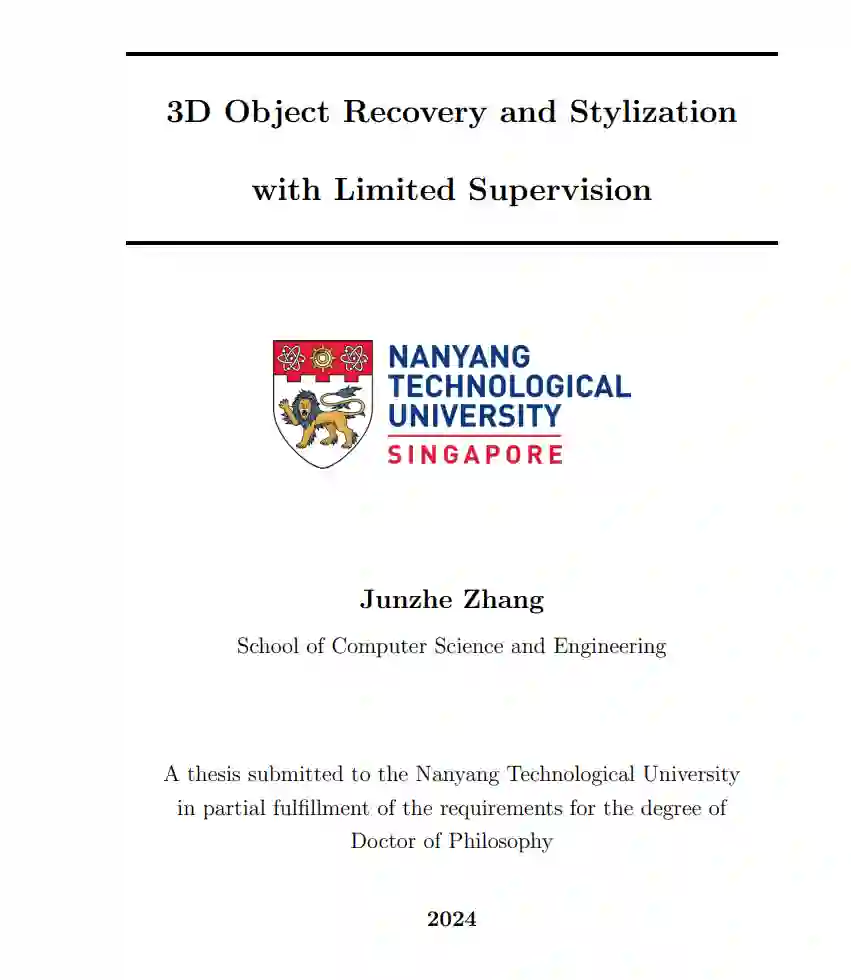 在过去的十年里,深度学习引发了计算机视觉领域的革命,尤其是在二维图像感知与生成方面的巨大进展。这一突破主要归功于大量可用的训练数据,即图像数据。然而,我们所处的真实世界是三维的,理解周围环境的几何结构与视觉外观对于深度学习系统至关重要。这些系统构成了众多应用的基础,包括机器人技术、虚拟/增强现实、视觉生成式人工智能(AIGC)、电子游戏和元宇宙等。然而,3D数据的获取通常成本高昂且充满挑战,导致用于训练深度学习模型的可靠3D真实数据极度稀缺。因此,迫切需要能够在有限观测条件下(如来自RGB相机的单目2D图像或来自深度传感器的不完整3D扫描)高效恢复或风格化3D物体的学习机制。 本论文聚焦于有限监督下的三维任务,即训练数据有限且不完整的场景。具体而言,本文关注以下三个任务:(1) 3D形状补全,即训练时可用的部分-完整形状对极为有限;(2) 3D纹理网格重建,训练数据仅由单目图像集合组成;(3) 3D人脸卡通化,训练过程中仅能获得伪2D真实标签。为了解决这些挑战,本研究探讨了预训练的3D生成对抗网络(GANs)作为几何和视觉先验知识的宝贵来源。通过利用这些预训练模型中丰富的先验知识,目标是在这些具有有限监督的3D任务中开发出能够实现准确且稳健的形状补全、重建和风格化的有效解决方案。