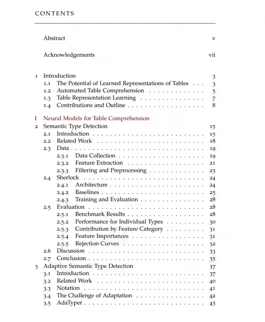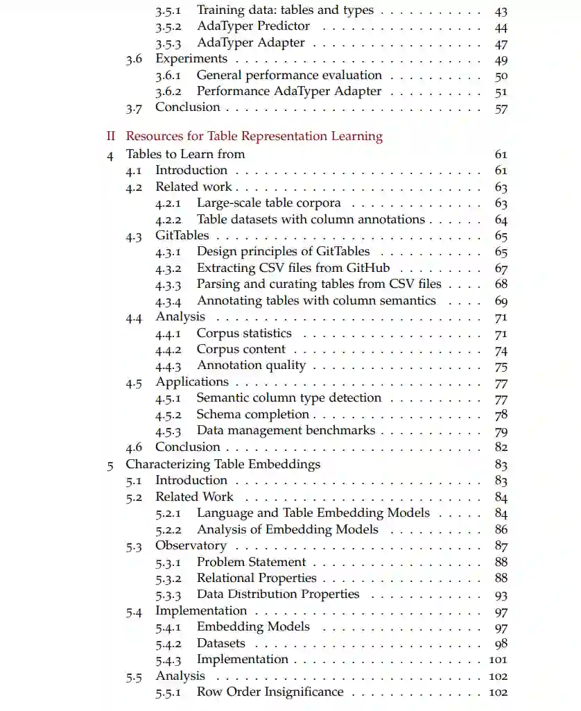 在这篇论文中,我们展示了对此主题探索的结果,从用于自动表格理解的神经嵌入方法开始。表格的语义,特别是其列的语义,决定了可以对其执行的操作。为此,我们贡献了Sherlock,这是一个用于以可扩展、健壮且准确的方式检测表格列的语义类型的深度学习模型。我们还展示了一个系统,AdaTyper,它能够有效且高效地将此类语义类型检测模型适应于未见过的数据分布和新的语义类型。 尽管具备适应功能,神经嵌入模型只有在训练数据充分代表上下文时才有效。由于现有的TRL模型通常是在从网页提取的表格上预训练的,这些表格并不能很好地代表现实世界中的表格,我们引入了GitTables:一个从存储在GitHub上的CSV文件中提取的大型关系表格语料库。GitTables中的表格更类似于典型的数据库表格,并且丰富了列的语义。最后,我们展示了Observatory,这是一个框架和工具,用于分析学习到的表格嵌入在关系表格的结构和内容特征方面捕获了什么。通过Observatory,我们识别了现有模型及其生成的表格嵌入的优点和缺点。 论文最后总结了我们的发现,并围绕表格表示学习的开放挑战和未来机会进行了讨论。