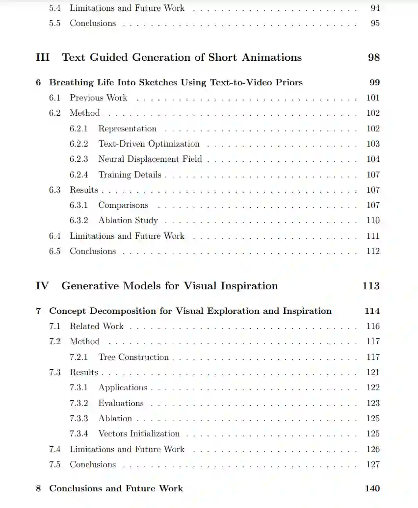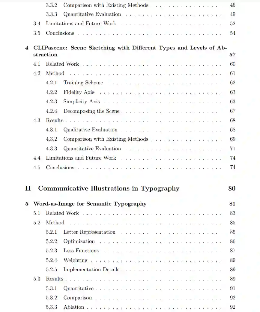 我们聚焦于草图与视觉抽象——视觉表达和创造力的基本元素。我们引入了两个基于优化的生成工具,CLIPasso 和 CLIPascene,用于从图像中生成不同抽象层次的草图。CLIPasso 专注于物体草图,通过调整矢量笔画的数量来控制抽象程度,而 CLIPascene 将这一方法扩展到场景草图,并拓展了草图抽象的概念。这两种工具利用预训练视觉-语言模型的先验知识来指导生成过程,减少了对人工绘制草图数据集的依赖。