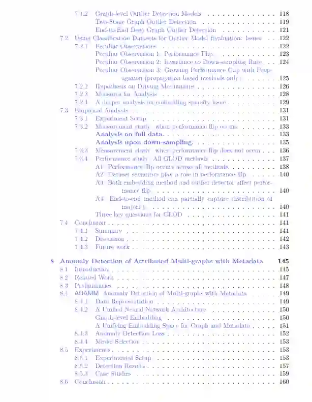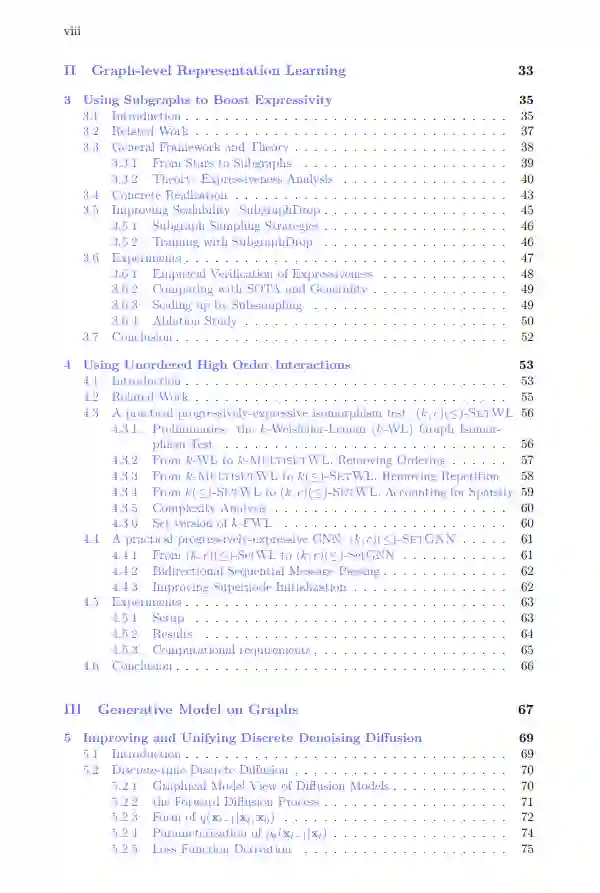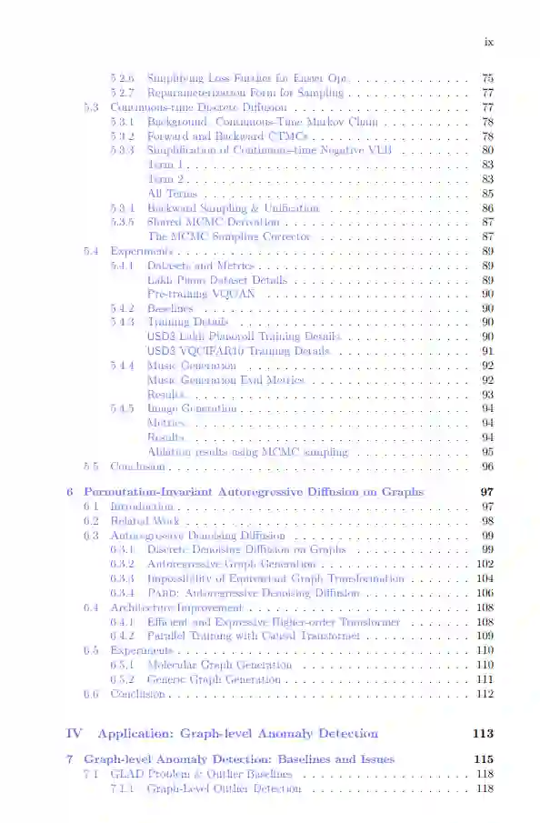 在第二部分,我深入研究了图级别的表示学习。与多层感知机(MLPs)不同,MLPs是表格数据的通用函数近似器,而图神经网络(GNNs)具有有限的表达能力。我探讨了两种方法来增强GNN的表达能力:使用有根子图来提高局部结构意识;以及探索无序的高阶交互,以实现与有序交互相当的表达能力,同时在实际应用中获得更好的可扩展性。 在第三部分,我专注于图的生成模型。与需要标签来学习任务依赖表示的判别模型不同,生成模型在无监督表示学习方面表现出色。然而,图生成由于其无序性而面临独特的挑战,这要求一种与任何特定顺序无关的方法。为了解决这个问题,我首先研究了应用于类别数据的扩散模型,并提出简化并统一现有的离散时间和连续时间离散扩散。基于统一的离散扩散,我提出了一种基于部分顺序的扩散模型,将自回归方法与扩散模型相结合,用于图生成。该方法为图上的生成预训练奠定了基础。 在最后一部分,我探索了图表示学习的应用。具体而言,我研究了图级别异常检测(GLAD),该方法具有许多重要应用。由于GLAD研究较少,我建立了一个基于图神经网络的强基准模型“OCGIN”,一个包含数据集和许多非图神经网络基准的评估平台。我还发现并研究了一个名为“性能反转”的问题。随后,我设计了一个特定模型,用于检测普华永道的可疑会计交易,该任务需要处理带属性的图数据。
