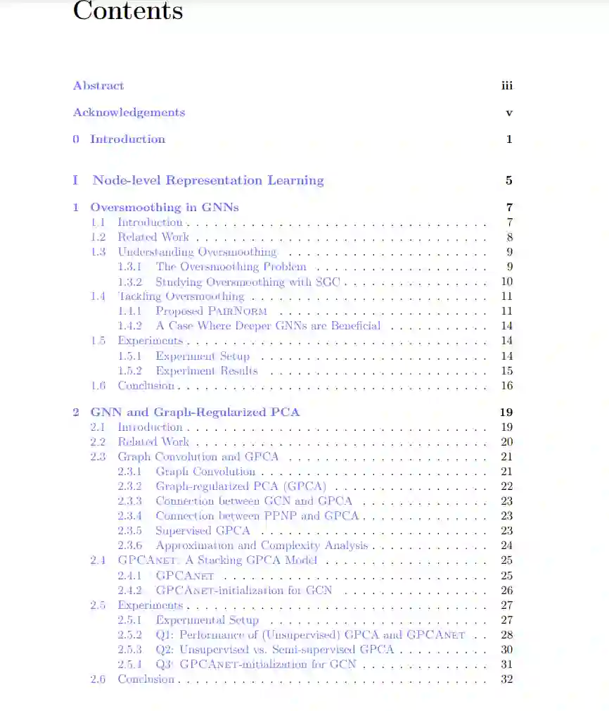 图在现实世界中广泛应用于表示关系,许多数据自然可以通过图来表示,如社交网络、蛋白质结构、分子和交易等。与具有特定自然顺序的图像和文本不同,图是无序的,并且具有排列不变性,这为学习良好的表示带来了显著的困难。图神经网络(GNNs)被提出并不断改进,用于图表示学习。本文在节点级别和图级别表示学习方面进行了研究,并提出了朝着更强大的表示学习迈进的解决方案,目标是实现图的基础模型。 在第一部分,我专注于节点级别的图表示学习,并解决一个关键问题——“表示过度平滑”。为了进一步理解图卷积网络(GCNs)的优势,我们探讨了神经网络与主成分分析(PCA)之间的关系。我们的研究表明,图正则化PCA的解与单个图卷积层的公式是相一致的。