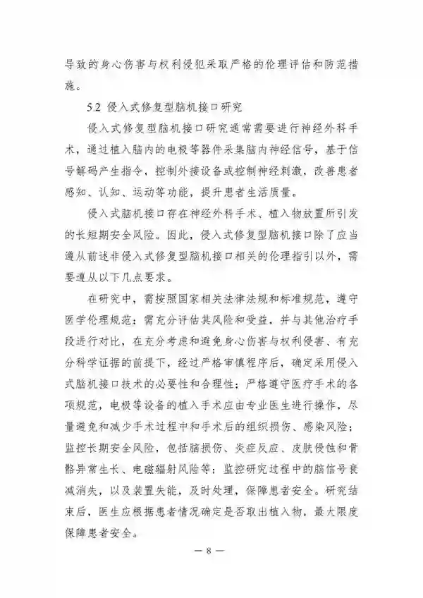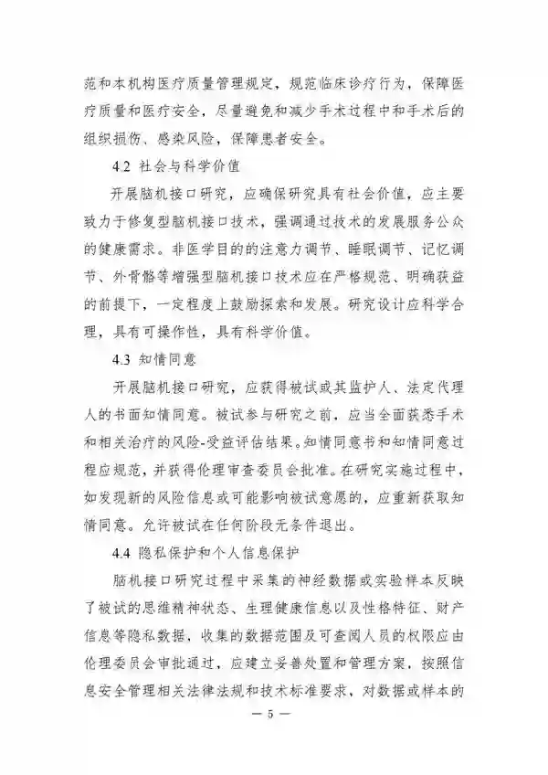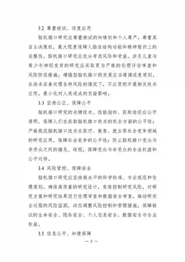 来源:科学技术部 时间:2024-02-18 14:22:48 作者: 日前,中国科学技术部在官方网站发布《脑机接口研究伦理指引》(以下简称“《指引》”),以供相关科研机构和人员参考。这是中国首次专门编制关于脑机接口研究的伦理指引文件。 脑机接口(Brain-computer interfaces,BCIs)是各国重点布局的前沿技术之一。随着相关研究的逐渐增多和产品的日趋成熟,脑机接口研究的伦理问题开始受到关注。 《指引》对脑机接口技术中的术语和技术分类做了明确的界定与划分,澄清了伦理审查工作中可能遇到的概念模糊。《指引》还提出脑机接口研究的六项基本原则,分别是保障健康、提升福祉;尊重被试、适度应用;坚持公正、保障公平;风险管控、保障安全;信息公开、知情保障;支持创新、严格规范。 具体内容如下
