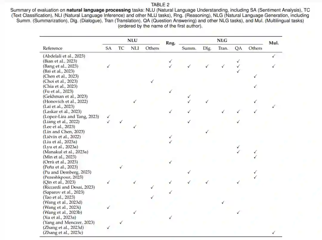 开发语言模型,特别是大型语言模型的最初目标是提高自然语言处理任务的性能,包括理解和生成。因此,大多数评估研究主要集中在自然语言任务上。表2总结了现有研究的评估方面,我们主要在以下内容中强调他们的结论。