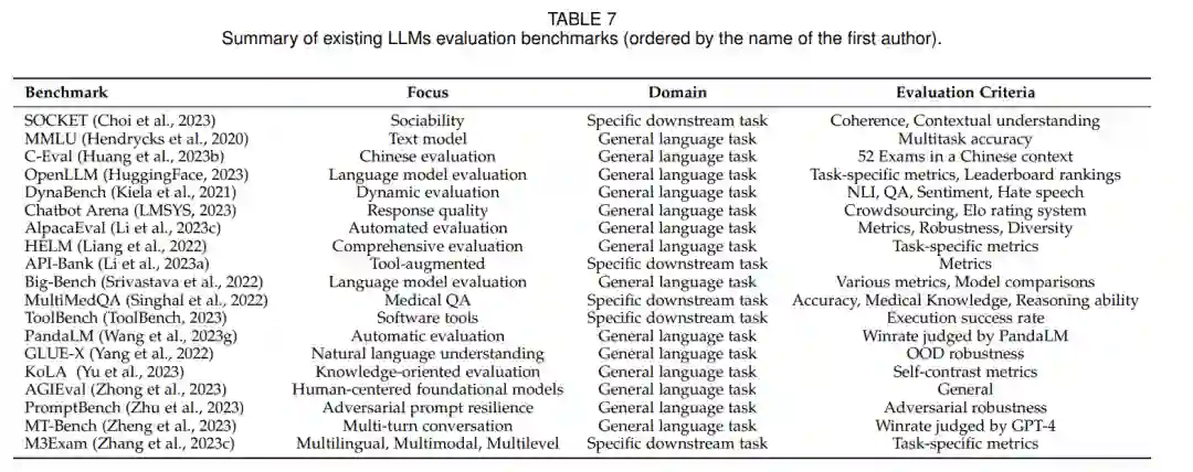 测试 LLMs 的评估数据集用于测试和比较不同语言模型在各种任务上的性能,如第 3 节所示。这些数据集,如GLUE(Wang等人,2018年)和SuperGLUE(Wang等人,2019年),旨在模拟现实世界的语言处理场景,并涵盖多样化的任务,如文本分类、机器翻译、阅读理解和对话生成。本节不会讨论针对语言模型的任何单一数据集,而是针对LLMs的基准。由于LLMs的基准正在发展,我们在表7.5中列出了19个流行的基准。每个基准都关注不同的方面和评估标准,为各自的领域提供了宝贵的贡献。为了更好的总结,我们将这些基准划分为两个类别:通用语言任务的基准和特定下游任务的基准。