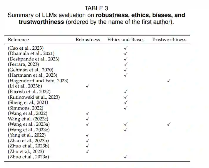 评估LLMs包括鲁棒性、伦理、偏见和可信度等关键方面。这些因素在全面评估LLMs的性能方面越来越重要。