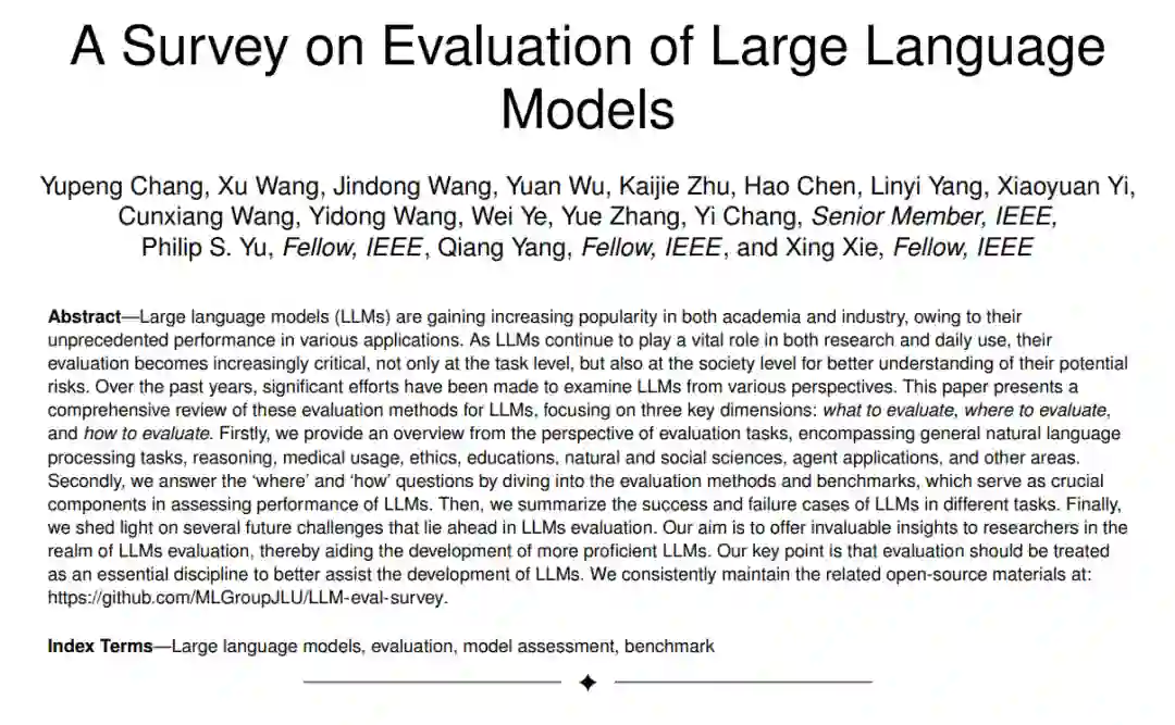 **评估具有深远的意义,在AI模型,尤其是大型语言模型的进步中变得至关重要。**本文提出了第一份从三个方面对LLMs的评估进行全面概述的调查:评估什么、如何评估和在哪里评估。我们的目标是通过封装评估任务、协议和基准,增强对LLMs当前状态的理解,阐明它们的优点和局限性,并为未来LLMs的进步提供洞见。我们的调查显示,当前的LLMs在许多任务中都存在一定的限制,特别是推理和鲁棒性任务。同时,现代评估系统需要适应和发展的需求仍然明显,以确保准确评估LLMs的固有能力和局限性。我们确定了未来研究应该解决的几个重大挑战,希望LLMs可以逐步增强它们对人类的服务。