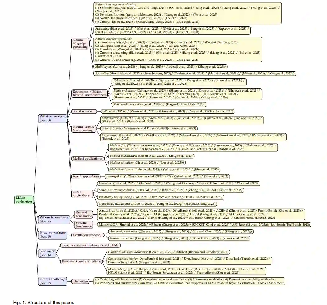 由于若干原因,评估对于LLM的成功至关重要。首先,评估LLM可以帮助我们更好地理解LLM的优点和缺点。例如,PromptBench(Zhu等人,2023)基准测试表明,当前的LLM对对抗性提示敏感,因此需要仔细的提示工程设计以获得更好的性能。其次,更好的评估可以为人与LLM的交互提供更好的指导,这可能激发未来的交互设计和实现。第三,LLM的广泛适用性强调了确保其安全性和可靠性的至关重要性,特别是在如金融机构和医疗设施等对安全敏感的领域。最后,随着LLM变得越来越大,具有更多的新出现的能力,现有的评估协议可能无法足够评估它们的能力和潜在风险。因此,我们的目标是通过回顾当前的评估协议,尤其是对设计新的LLM评估协议的未来研究进行深入研究,以提醒社区注意到LLM评估的重要性。随着ChatGPT(OpenAI,2023a)和GPT-4(OpenAI,2023b)的推出,有许多研究工作试图从不同的角度评估ChatGPT和其他LLM(图2),包括自然语言任务、推理、鲁棒性、可信度、医疗应用和伦理考虑等一系列因素。尽管做出了这些努力,但仍然缺乏对整个评估范围的全面概述。此外,LLM的持续演化也为评估提出了新的方面,从而挑战了现有的评估协议,并强化了需要彻底的、多方面的评估技术的需求。尽管像(Bubeck等人,2023)这样的现有研究声称GPT-4可以被视为AGI的火花,但由于其评估方法的人造性质,其他人对此进行了质疑。