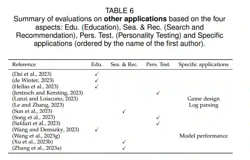 3.7 其他应用 除了上述分类,LLMs还在其他各种领域进行了评估,包括教育、搜索和推荐、性格测试和特定应用等。