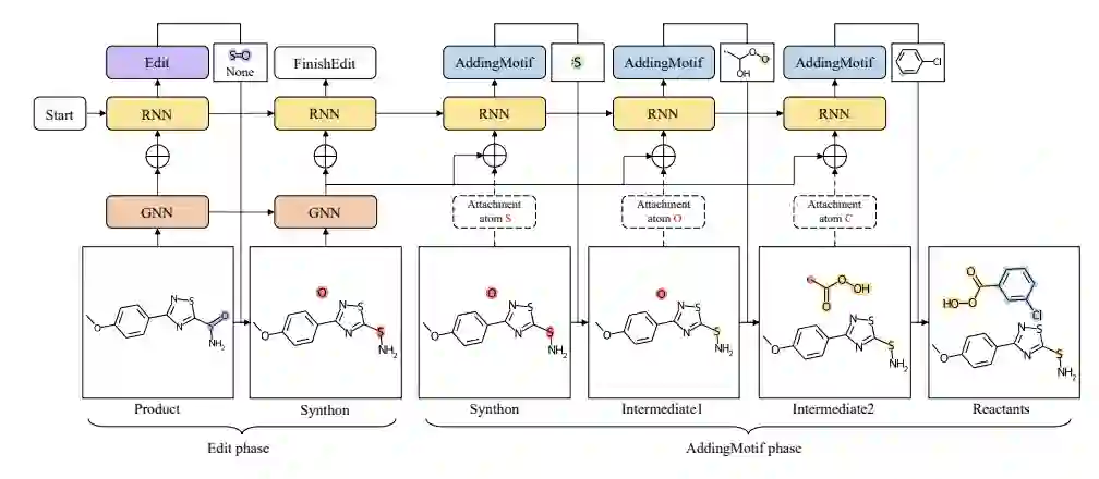 上图展示了这篇论文提出的方法的反应物生成过程。Edit 和 AddingMotif 指图形转换操作,其中 Edit 阶段描述从产物到合成子的键和原子变化,并起到反应中心识别的作用,而 AddingMotif 阶段通过向合成子添加适当motif来进行合成子补全。输入分子图由图形神经网络(GNN)编码,而递归神经网络(RNN)则按顺序预测图形转换操作。在 Edit 阶段,RNN 预测一系列 Edit 操作,直到 FinishEdit 指示 Edit 阶段的结束以及 AddingMotif 阶段的开始。在 AddingMotif 阶段,RNN 依次添加motif,直到没有附着原子(用粉红色突出显示)留下。在上图示例中,第一个 Edit 操作应用于 S=O 键,新键类型为 None,表示删除键。对于 AddingMotif 操作,motif 中的接口原子(绿色)和 合成子/中间产物中的附着原子表示相同的原子,并在将 motif 附加到合成子/中间产物时合并为单个原子。