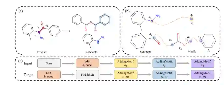 序列地模拟逆合成过程需要将其转化成序列。首先将逆合成看作两个阶段,即上述Edit阶段和AddingMotif阶段。前者用三元组的形式定义token,(编辑行为,编辑对象,编辑状态),例如上图中的(edit,b,none)表示在图(a)所示的逆合成过程中反应中心是化学键b而none表示编辑后该键的状态是none即删除了化学键b;后者对于输入序列token包含AddingMotif和添加motif的对象附着原子的索引,而对目标序列token包含AddingMotif和motif索引以及motif中与附着原子对应的接口原子。添加辅助token Start和FinishEdit,以此将所有产物的逆合成过程描述为转换路径,包含一条输入序列和一条输出序列。而后,该模型在序列上用自回归形式进行学习。构建序列更详细的内容请参看原文。