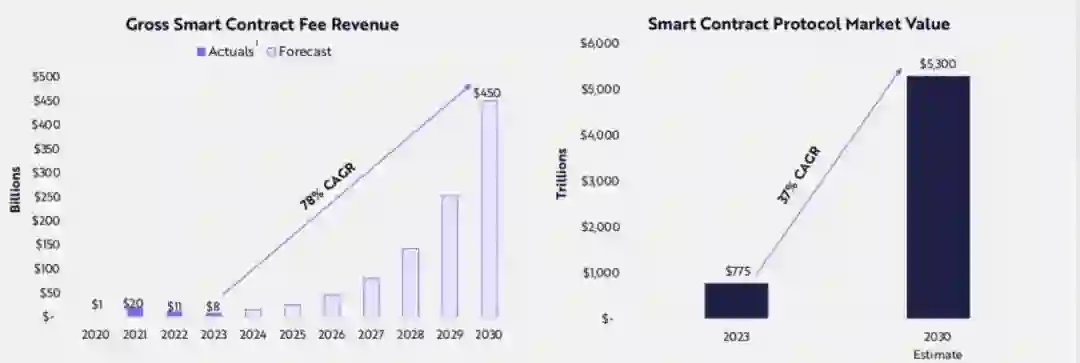 Big Ideas 2024 部署在公链上的智能合约为中介机构和传统金融基础设施提供了一种全球性、自动化和可审计的替代方案。 ARK的研究指出,智能合约可以降低金融服务的成本。智能合约能够以传统金融成本的一小部分便利地促进链上资产的起源、所有权和管理。 如果金融资产以类似于互联网采用的速度迁移到区块链基础设施,并且与去中心化金融服务相关的费用率是传统金融服务的三分之一,那么智能合约可能产生逾4500亿美元的年度费用,并在2023年通过分别以78%和32%的复合年增长率创造逾5万亿美元的市值。