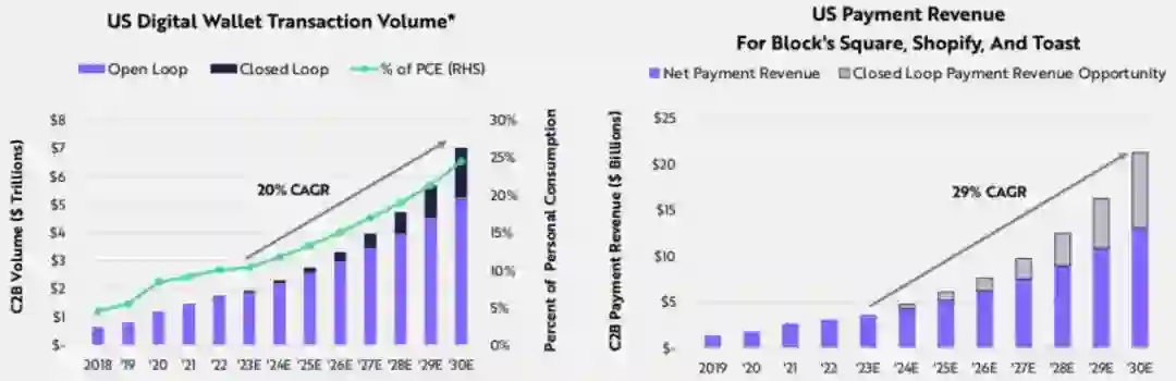 Big Ideas 2024 头部垂直软件平台通过数字钱包打造一套闭环的消费体系,促进从消费者到商家、商家到员工、员工到商家的闭环交易。根据ARK的研究这些平台上的数字钱包将实现完全封闭的支付生态系统。 ARK认为,未来七年内,C2B数字钱包支付总额将以每年20%的速度增长,从2023年的约2万亿美元增长到2030年的约7万亿美元。闭环支付的占比将从4%增加到25%,Block's Square、Shopify和Toast的支付收入预测从35亿美元增加到210亿美元,年化增长率为29%。
