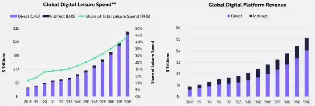 有五个趋势正在加速向数字休闲的转变: 1)流媒体电视正在取代有线电视。短短两年内,截至2023年7月,流媒体在整体电视消费中的份额增长了10个百分点以上,达到39%,分别超过了有线电视和广播的份额。互联网电视(CTV)广告正在以17%的复合年增长率,从2013年的250亿美元增长到2030年的730亿美元。 2)社交商务收入预计将以每年32%的年复合增长率增长,从2023年的7300亿美元增长到2030年的超5万亿美元。 3)体育博彩将继续受到在线/移动博彩合法化的推动。随着在线体育博彩在2023年激增35%DraftKings和FanDuel提供了卓越的用户体验,有助于从其他体育博彩中获得份额。 4)AI辅助视频游戏创作是游戏领域的新浪潮。人工智能会使内容创作民主化,并加速UGC的增长。Roblox已经在全球范围内提供了超过4.7亿的体验,是PC,游戏机和移动游戏总数的52倍。 5)支持AI的硬件可以重新定义个人可穿戴计算,尤其是在VR继续面临挑战的情况下。 数字钱包
