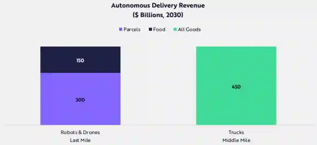 Big Ideas 2024 未来5到10年内,自主物流将把货物运输成本降低15倍。自主无人机和机器人届时将完成数百万次交付,而自主卡车运输公司记录了数千万英里,并且无需安全驾驶员。 根据ARK的研究,到2030年全球自动配送收入将达到9000亿美元,机器人和无人机的食品和包裹递送费用将达到4500亿美元,自动驾驶卡车运输收入也将达到4500亿美元。